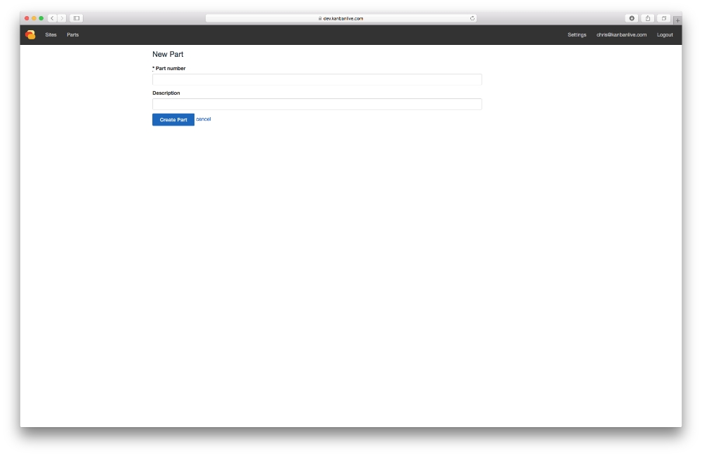 To create a new part click the Parts item on the top toolbar, and then click the New Part button. Enter the part number and description as required. Click the Create Part button once finished.